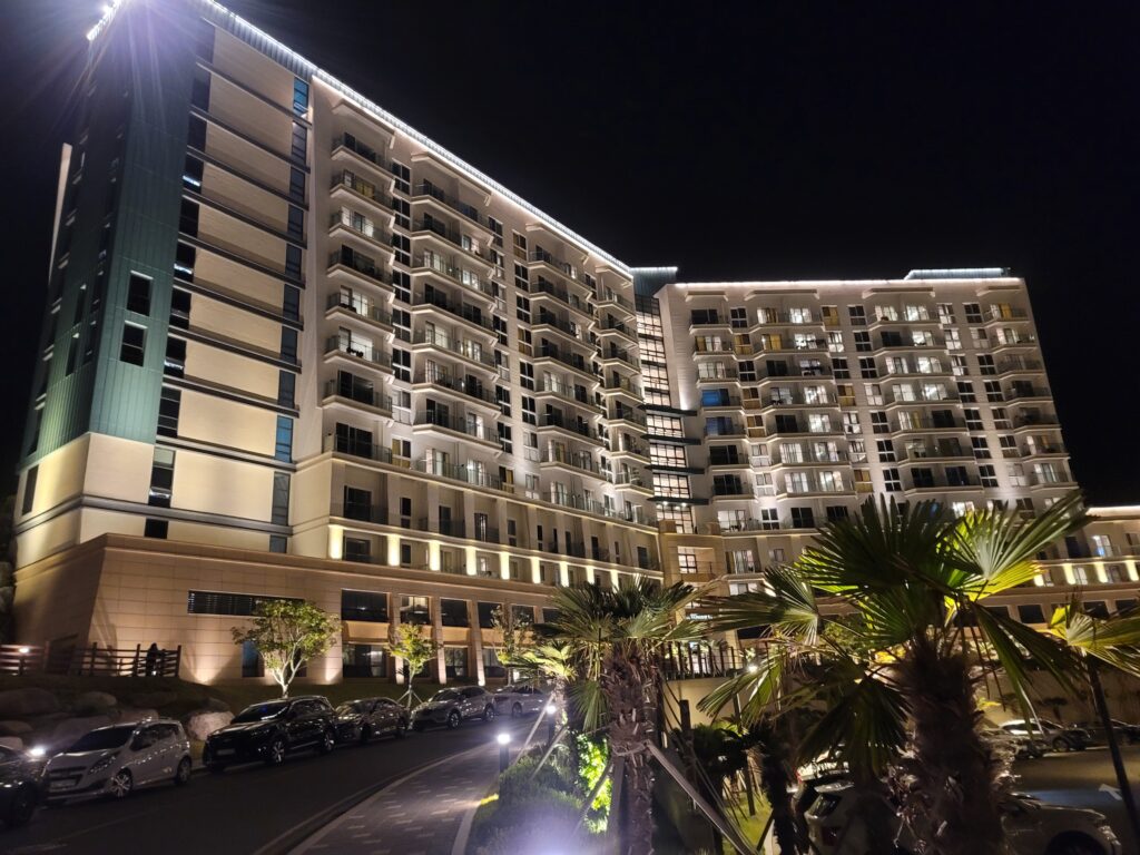 리조트 입구에 위치한 웰컴센터와 야경이 정말 인상적이었습니다. 입구 중앙에는 커다란 시계가 세워져 있어서 리조트의 상징처럼 느껴지더라고요. 특히 밤이 되면 조명이 은은하게 켜져서 건물 외관이 더욱 고급스럽고 아름답게 보입니다.